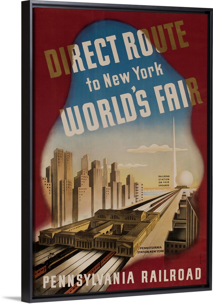 <p>1939 Pennsylvania Railroad travel poster showing a direct line from Pennsylvania Station to the Trylon and Perisphere. Illustrated by Sasha Maurer</p>