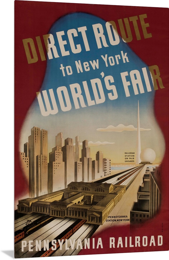 <p>1939 Pennsylvania Railroad travel poster showing a direct line from Pennsylvania Station to the Trylon and Perisphere. Illustrated by Sasha Maurer</p>