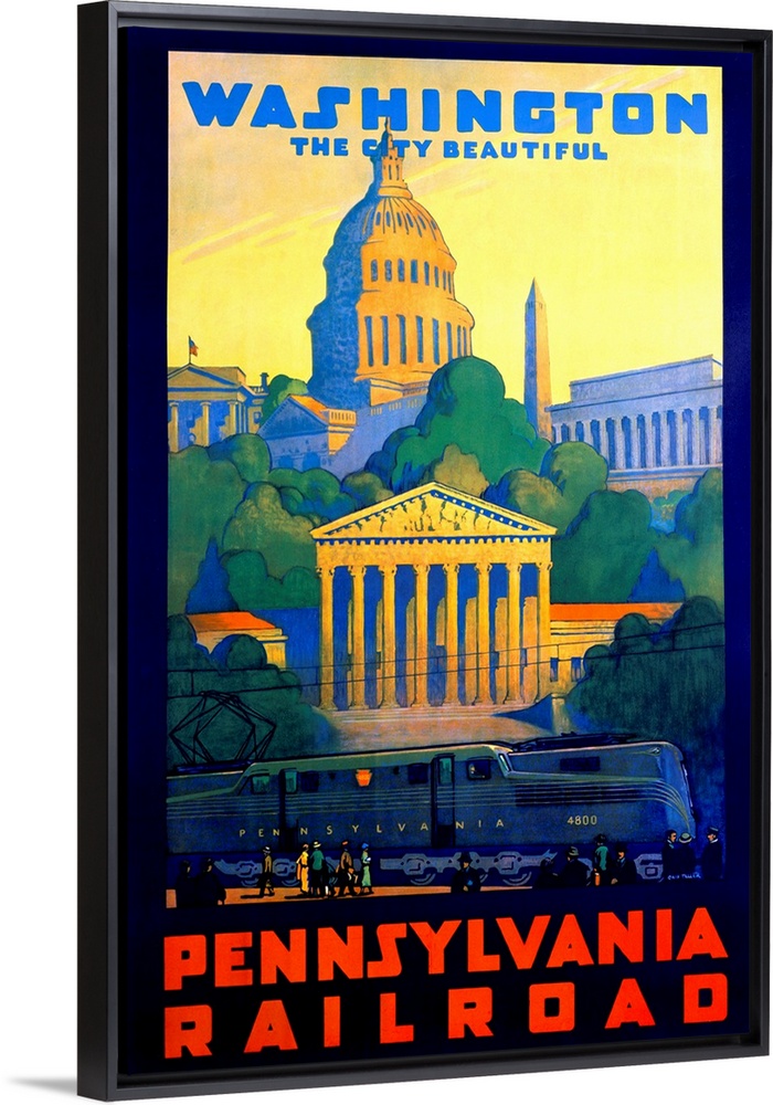<p>Tall antique poster advertisement with the different iconic D.C. monuments with a big train in front of them.</p>