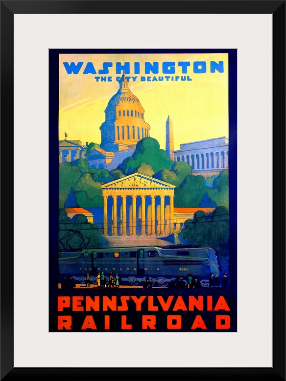 <p>Tall antique poster advertisement with the different iconic D.C. monuments with a big train in front of them.</p>
