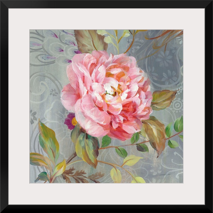 <p>Contemporary square painting of a pink peony on a gray paisley patterned background.</p>
