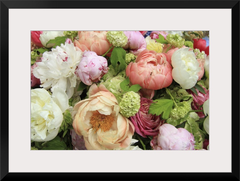 <p>Peonies in various shades of pink and white in a floral wedding arrangement.</p>