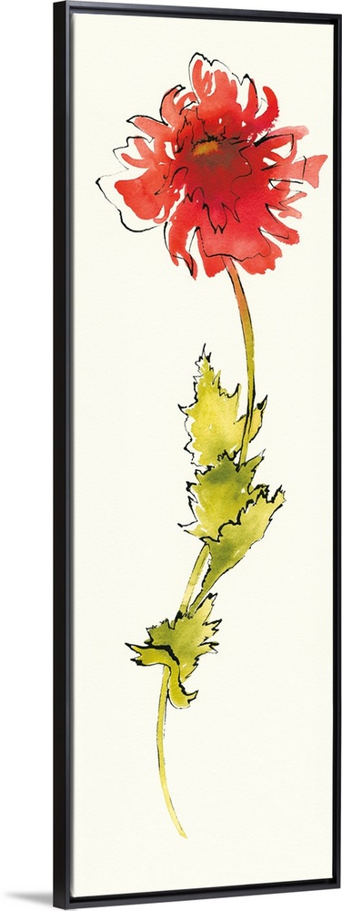 <p>Tall, vertical panel with a watercolor painting of a red flower and a long green stem outlined in black pen and ink.</p>