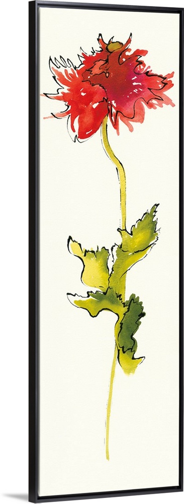<p>Tall, vertical panel with a watercolor painting of a red flower and a long green stem outlined in black pen and ink.</p>