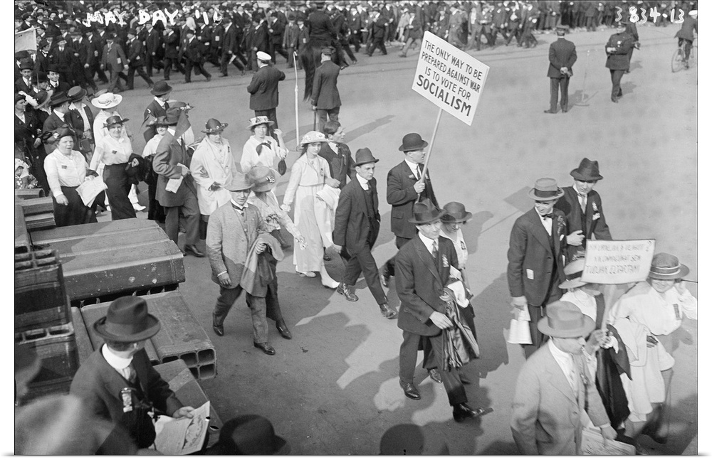 <p>Women and men marching at the May Day Parade as one man holds a sign promoting Socialism in New York City. Photograph, 1916.</p>