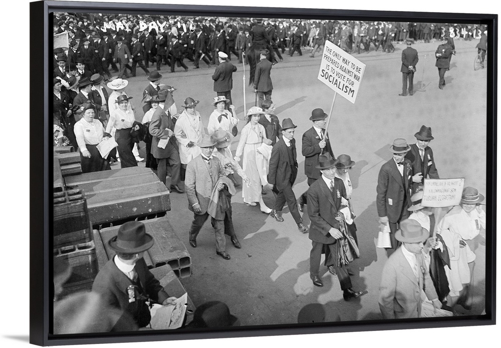 <p>Women and men marching at the May Day Parade as one man holds a sign promoting Socialism in New York City. Photograph, 1916.</p>