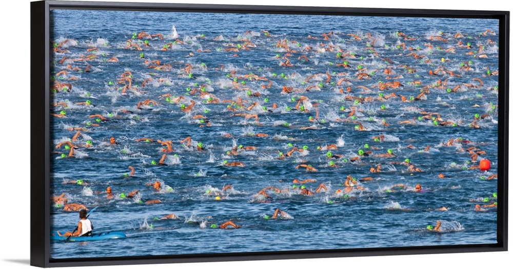 <p>Horizontal photo on canvas of triathletes swimming in the ocean during the Ironman Kona race.</p>