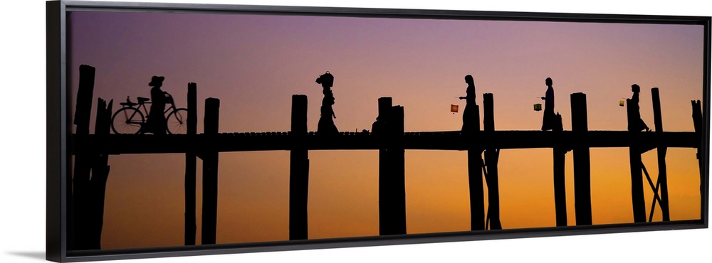 <p>People crossing the Ubein Bridge in Mandalay, Burma, at sunset</p>