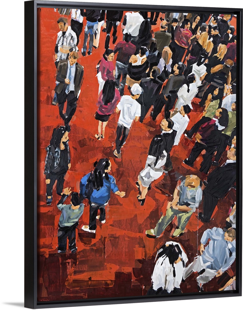 <p>Contemporary painting of a view of people standing on a red carpet from above.</p>