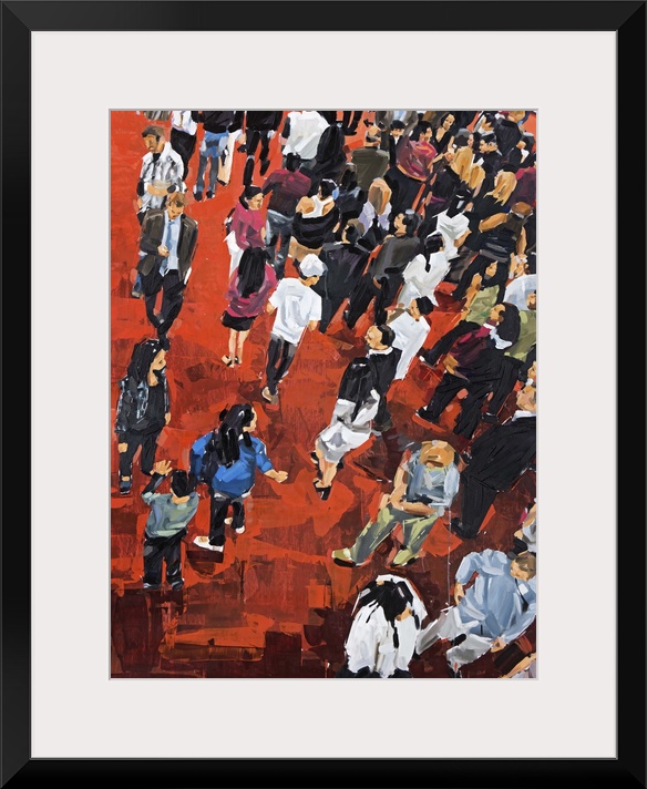 <p>Contemporary painting of a view of people standing on a red carpet from above.</p>