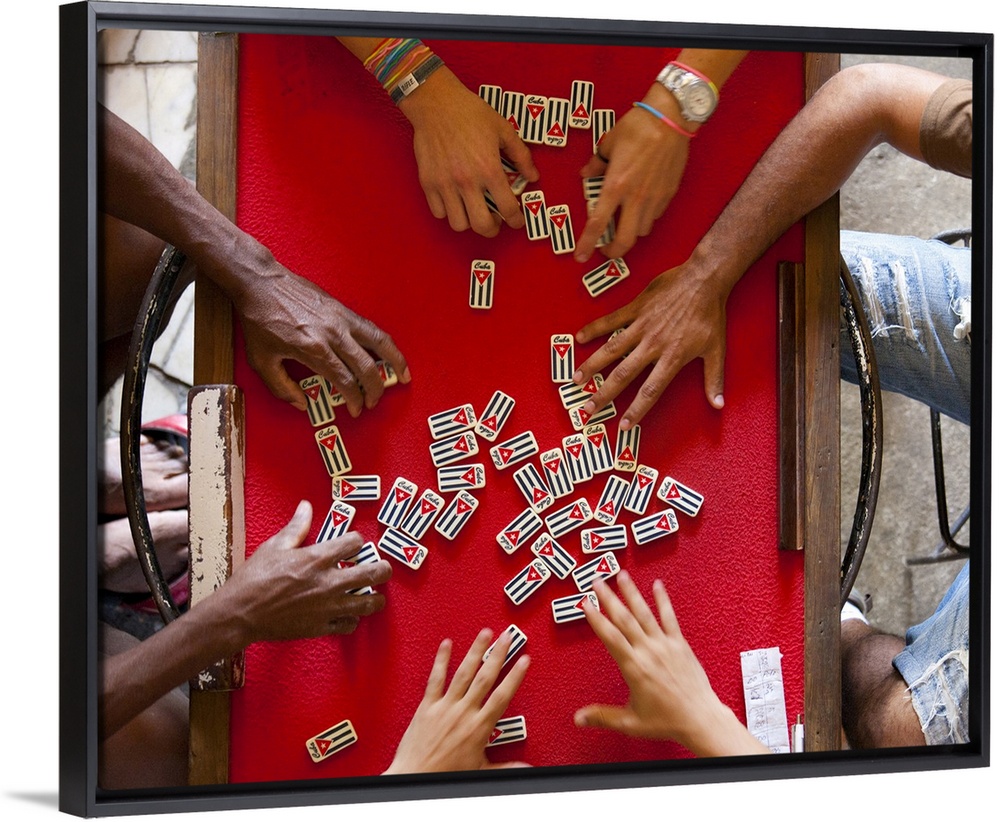 <p>Overhead view of people playing with dominos marked with country name and the Cuban flag, Havana, Cuba, West Indies, Central America</p>