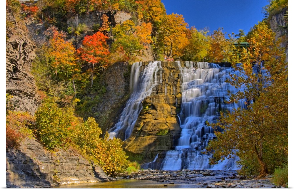 <p>This large piece is of a sizeable waterfall that is surrounded by autumn colored trees and foliage.</p>
