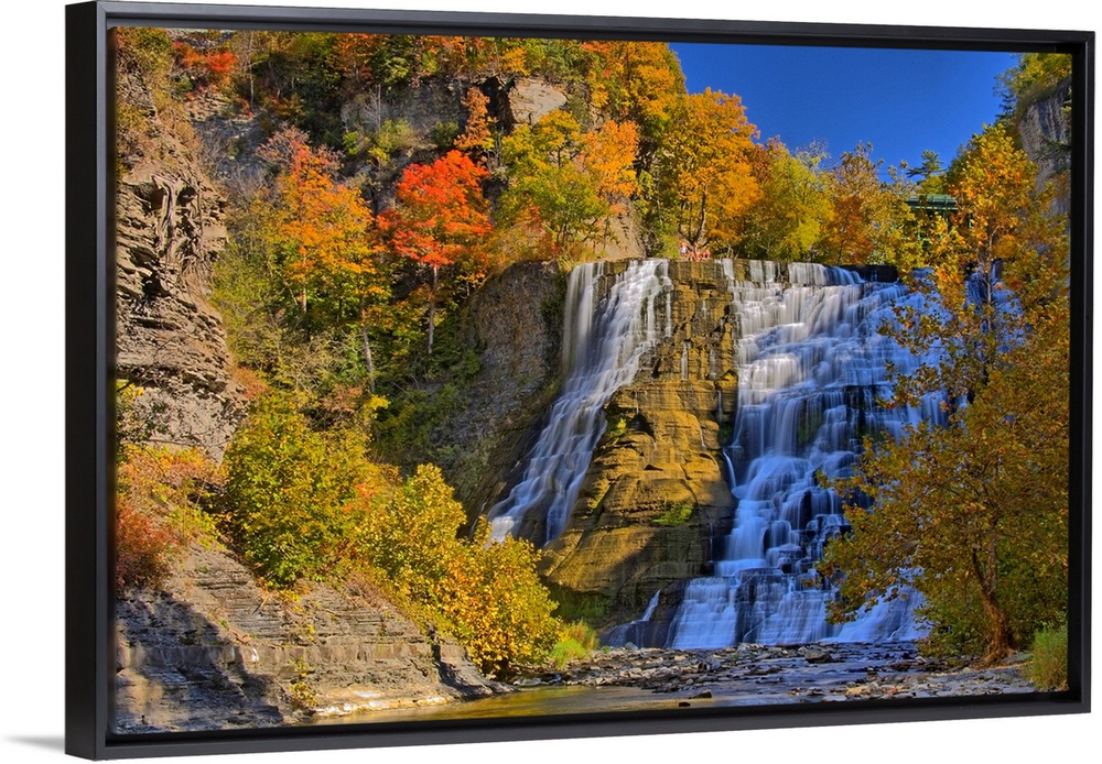<p>This large piece is of a sizeable waterfall that is surrounded by autumn colored trees and foliage.</p>
