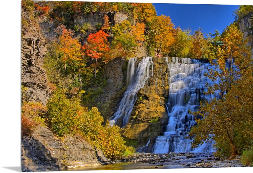 <p>This large piece is of a sizeable waterfall that is surrounded by autumn colored trees and foliage.</p>