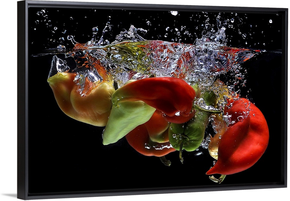 <p>Peppers falling into water, over black background.</p>