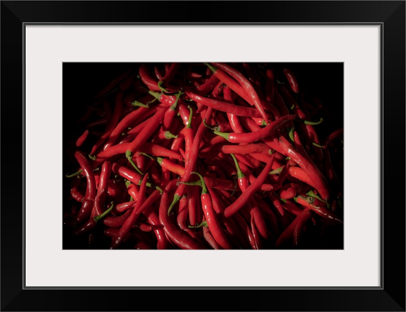 <p>Photograph of red cayenne peppers with a black vignette.</p>