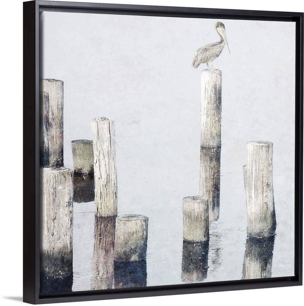 <p>Painting of a pelican perched on a post standing in the ocean.</p>