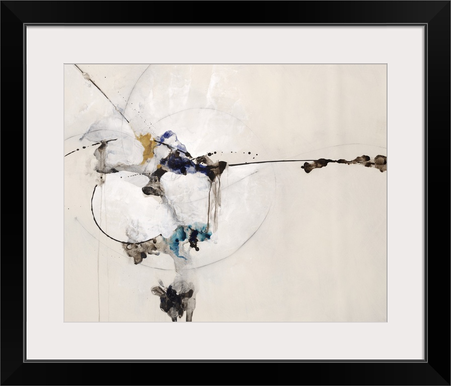 <p>Large abstract painting with a light beige background and blotchy lined designs with bright pops of blue and gold.</p>