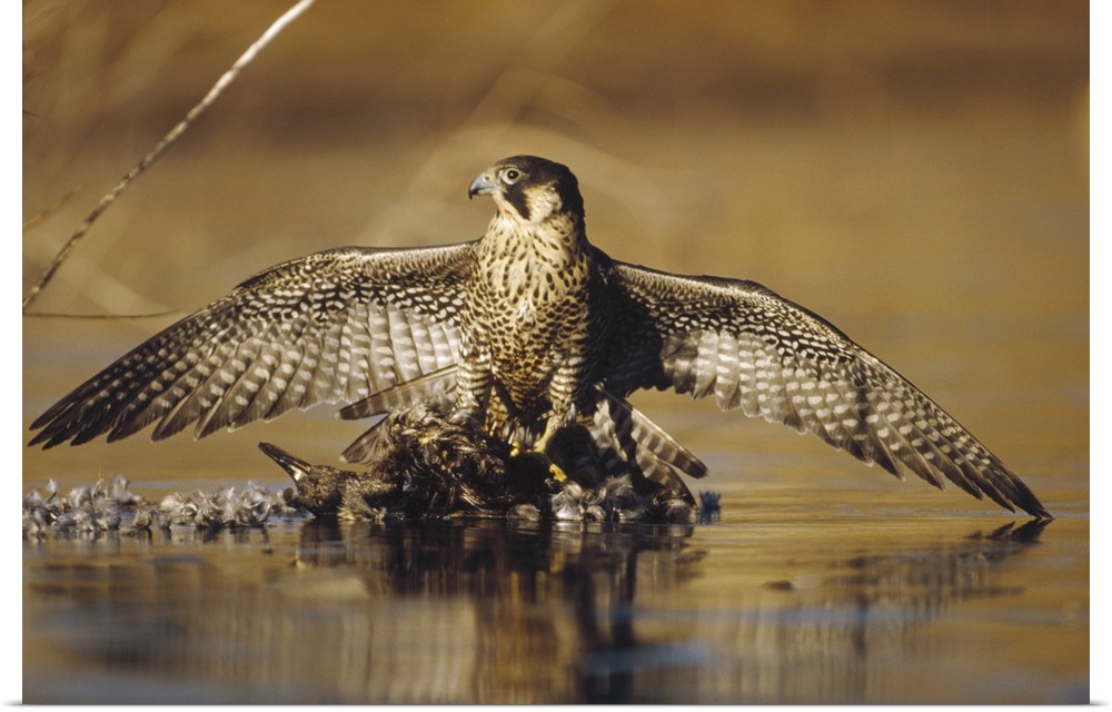 Peregrine Falcon adult in protective stance standing on downed duck, North America