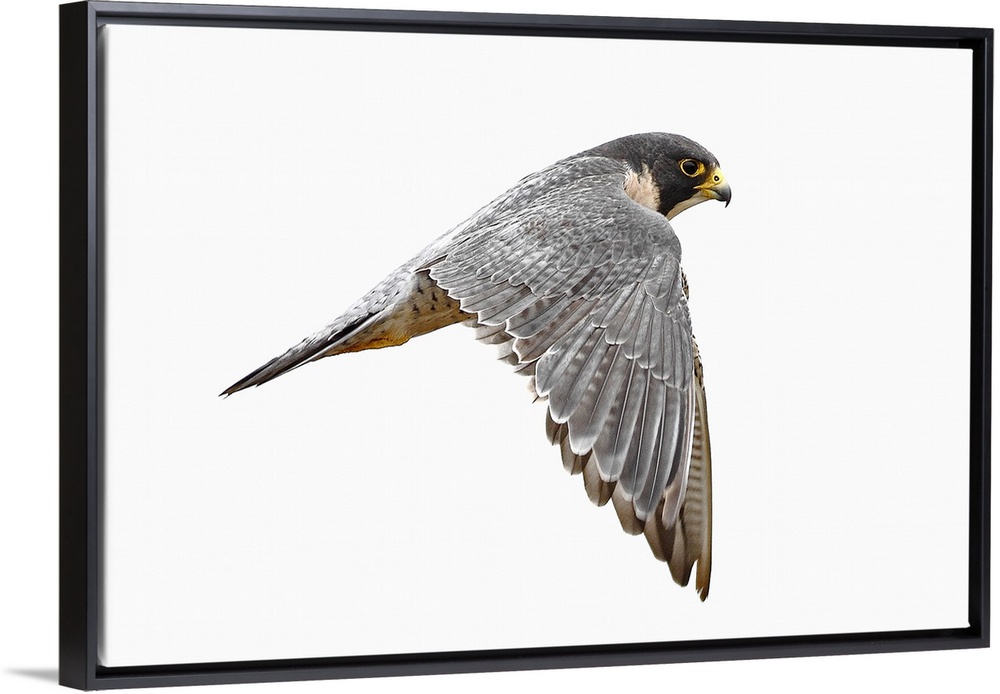 <p>peregrine falcon bird on white background due to overcast weather.</p>