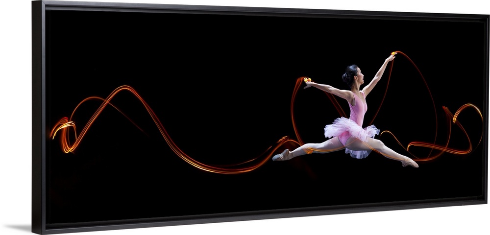 <p>A ballerina leaping, with light trails left in the air from her movements.</p>