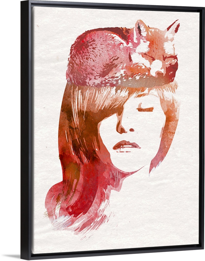 <p>Contemporary artwork of a woman with long red hair and a small fox sleeping on top of her head.</p>
