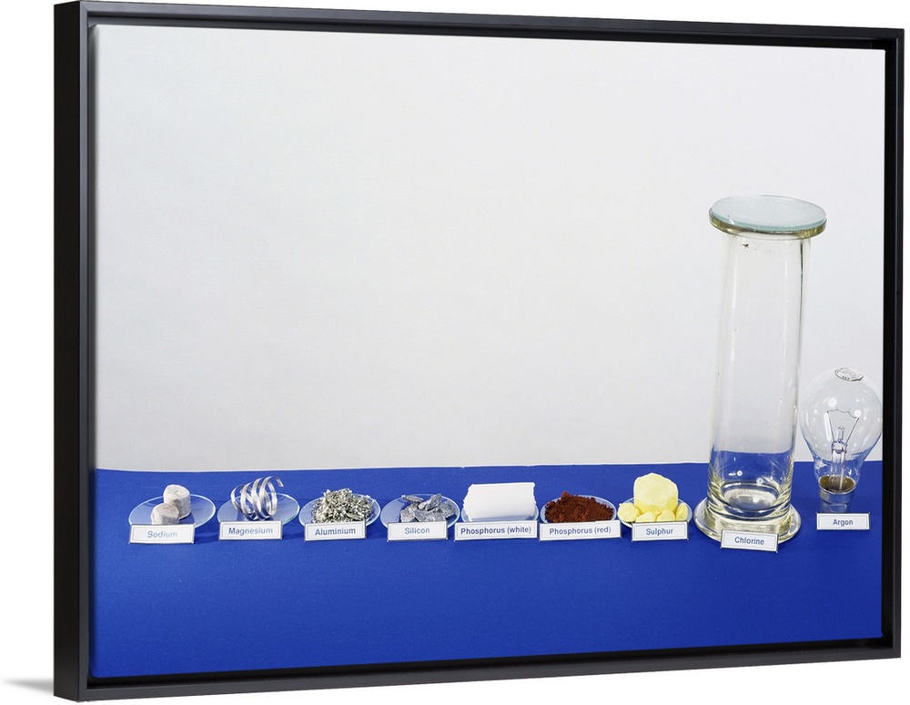 <p>Period 3 elements. From left (in their periodic table order) they are: sodium (Na); magnesium (Mg); aluminium (Al); silicon (Si); phosphorus (P, white/red); sulphur (S); chlorine (Cl); and argon (Ar). Successive elements across the period, have a single electron added, and this causes immense changes in the chemical and physical properties. Metals (Na/Mg/Al) become non-metals (P/S/Cl/Ar), solids become gases, and reactive elements (Na/Mg) become inert (Ar). Mg is used in flares, Ar in light bulbs, and Si in microchips. P and S have different structural forms (allotropes). Cl and Ar form diatomic (Cl2) and monatomic (Ar) molecules.</p>