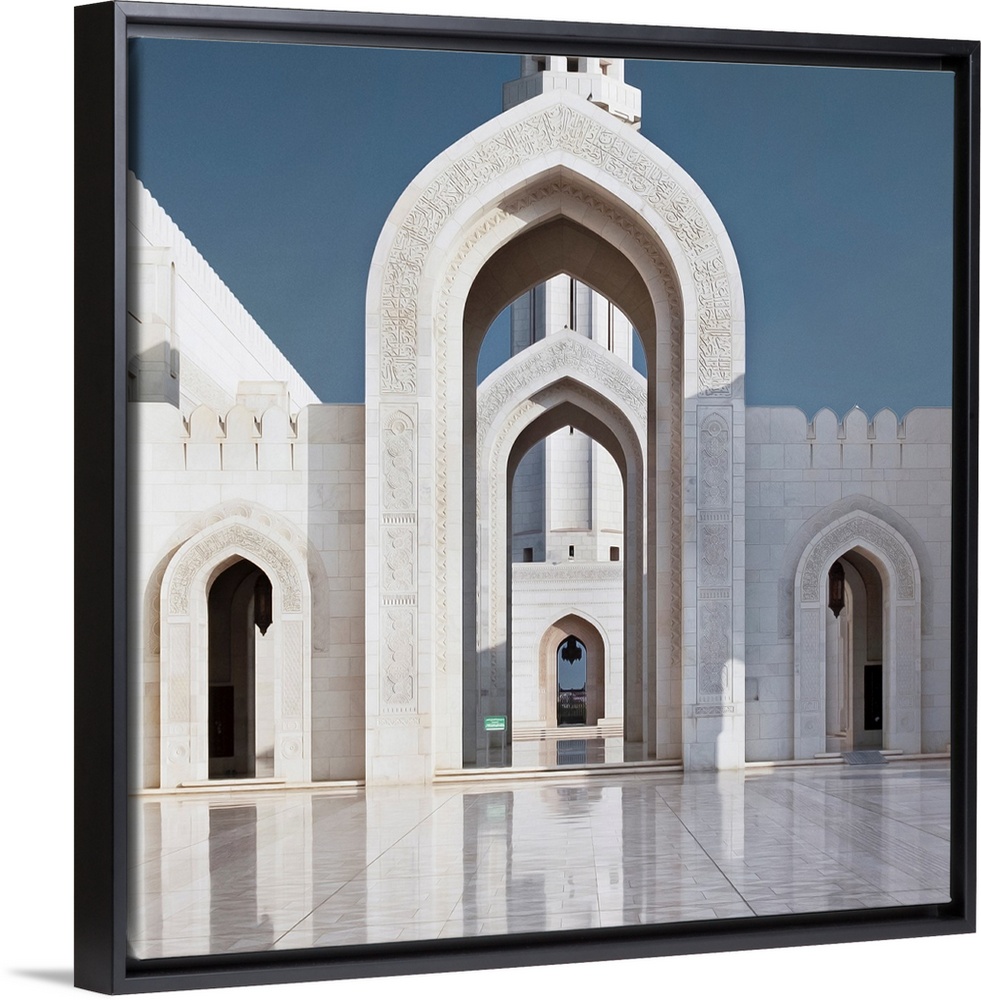 <p>Perspective on arches and minaret of Sultan Qaboos Mosque, Muscat, Oman, Middle East</p>