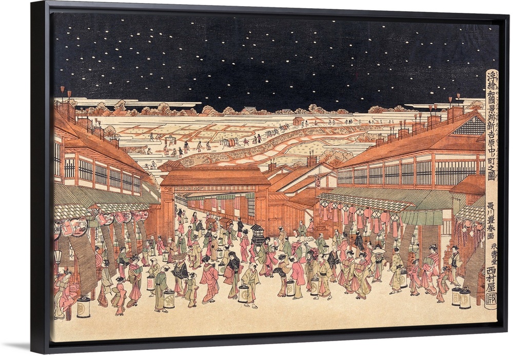 <p>Utagawa, Toyoharu, 1735-1814. Ukie wakoku no keiseki shin-yoshiwara nakanocho no zu. Date Created/Published: 1775, printed later. Color woodcut print. Print shows many people on the Nakanocho Boulevard at night near the gate to the Shin-Yoshiwara pleasure district of Tokyo, possibly during the lantern festival, with teahouses and shops lining the street. From the series: Perspective picture of famous places of Japan.</p>