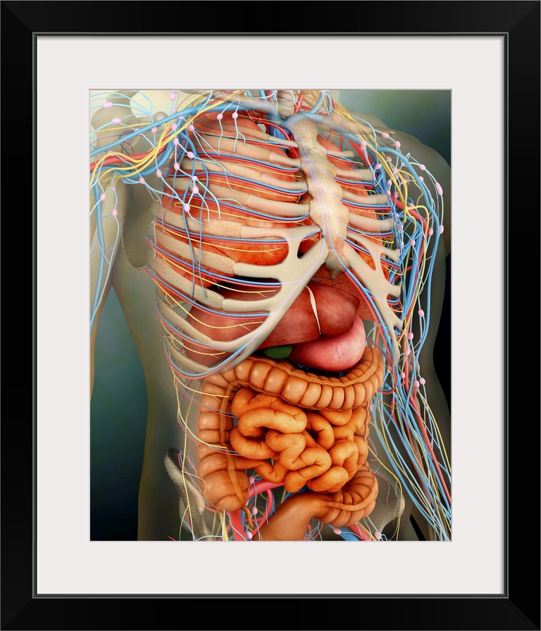 <p>Perspective view of human body, whole organs and bones.</p>