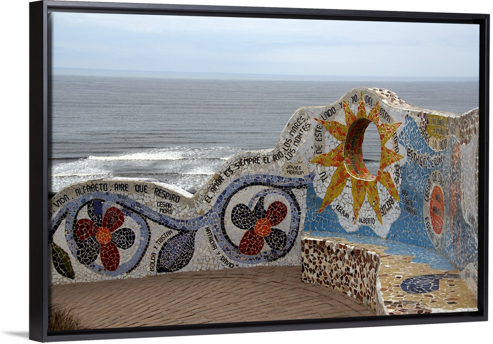 <p>South America, Peru, Lima, Miraflores. Love Park aka Parque del Amor. Colorful tile walls and benches in popular coastal park.</p>