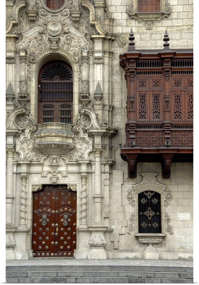 <p>South America, Peru, Lima. Historic Plaza de Armas (aka Plaza Mayor). Moorish style wooden balcony of the Archbishop's Palace.</p>