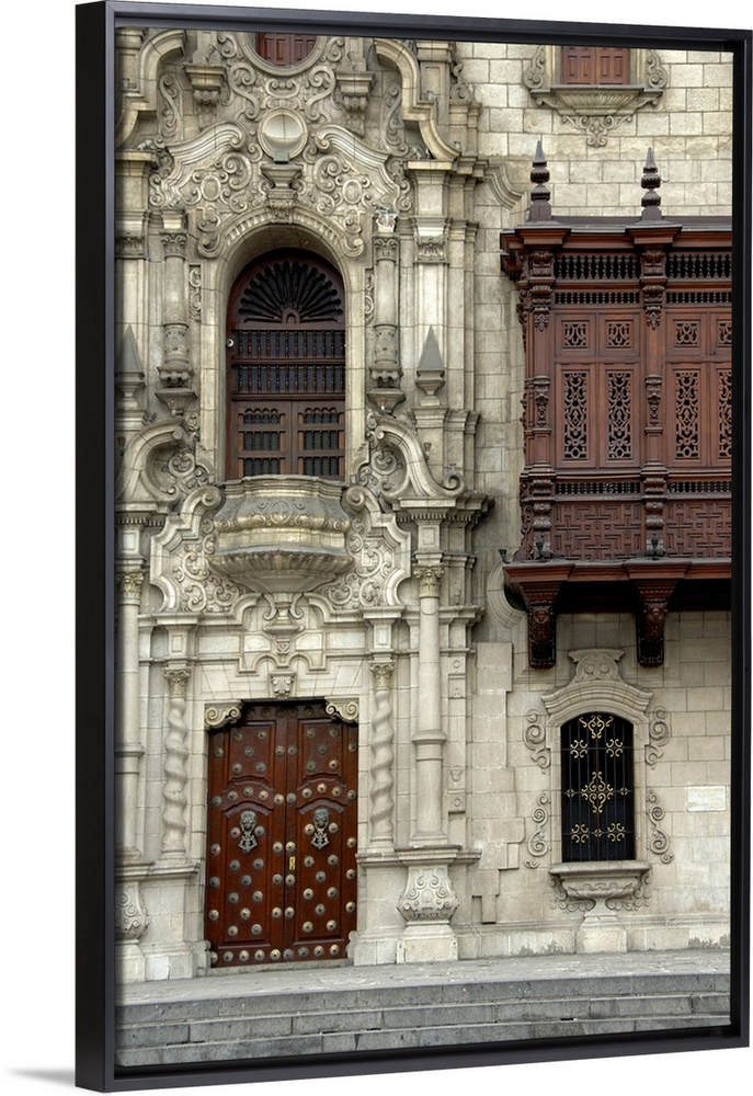 <p>South America, Peru, Lima. Historic Plaza de Armas (aka Plaza Mayor). Moorish style wooden balcony of the Archbishop's Palace.</p>