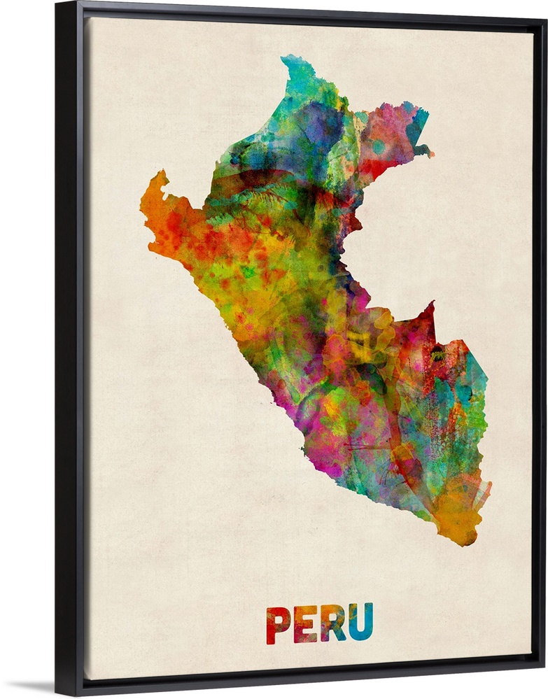 <p>Contemporary piece of artwork of a map of Peru made up of watercolor splashes.</p>