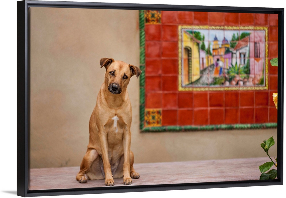 <p>Mexico, Baja Pensinula, Todos Santos, Dog sitting on porch beside mural at beachside home in Baja California Sur</p>