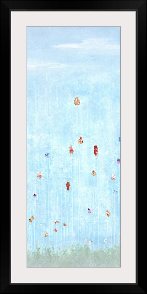 <p>Large panel painting of tall flowers on faint white stems coming up from faded green grass and light blue skies in the background.</p>