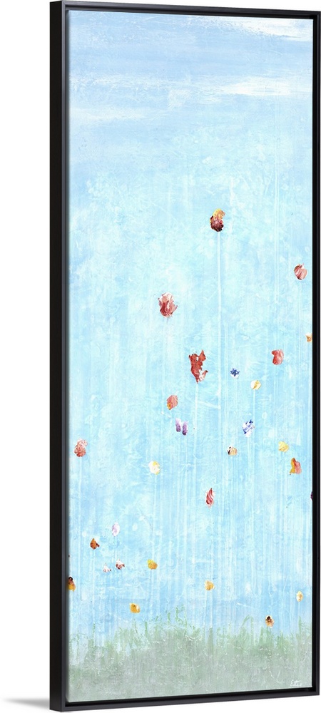 <p>Large panel painting of tall flowers on faint white stems coming up from faded green grass and light blue skies in the background.</p>