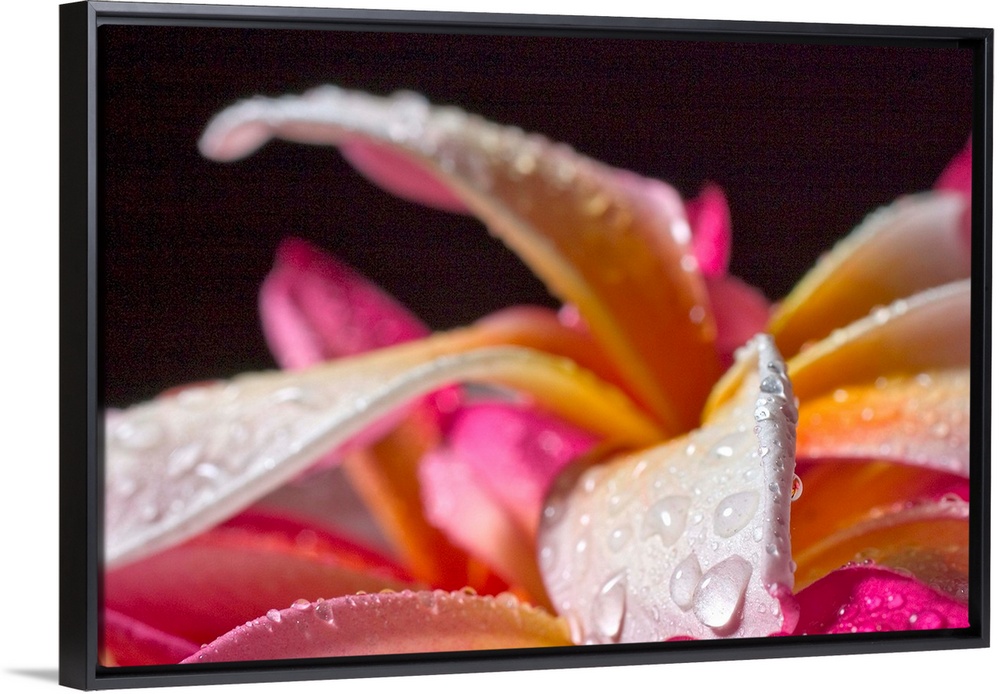 <p>Closeup abstract view of pink and yellow plumeria petals, wet with dew.</p>