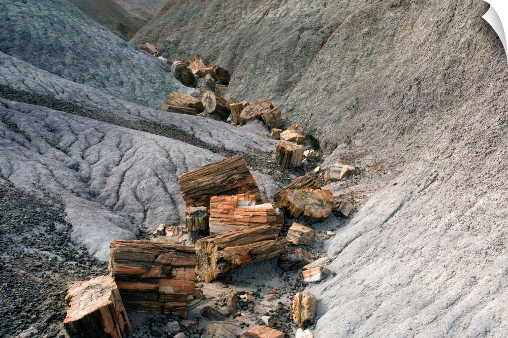 <p>Petrified wood. Petrified tree logs from the Late Triassic Period (over 206 million years ago). Petrification is a term used to describe the fossilisation of wood. It occurs when pieces of wood fall into sediments and are rapidly covered, preventing normal decay. Over long periods of time the wood decays. As it decays, the wood is replaced by minerals which are deposited from solution in ground water. This forms an exact replica of the original, preserving the texture of the bark and even the growth rings. Photographed in Petrified Forest National Park, Arizona, USA.</p>