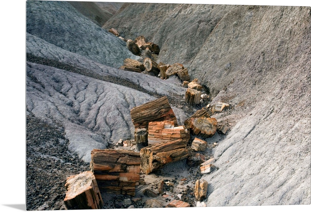 <p>Petrified wood. Petrified tree logs from the Late Triassic Period (over 206 million years ago). Petrification is a term used to describe the fossilisation of wood. It occurs when pieces of wood fall into sediments and are rapidly covered, preventing normal decay. Over long periods of time the wood decays. As it decays, the wood is replaced by minerals which are deposited from solution in ground water. This forms an exact replica of the original, preserving the texture of the bark and even the growth rings. Photographed in Petrified Forest National Park, Arizona, USA.</p>