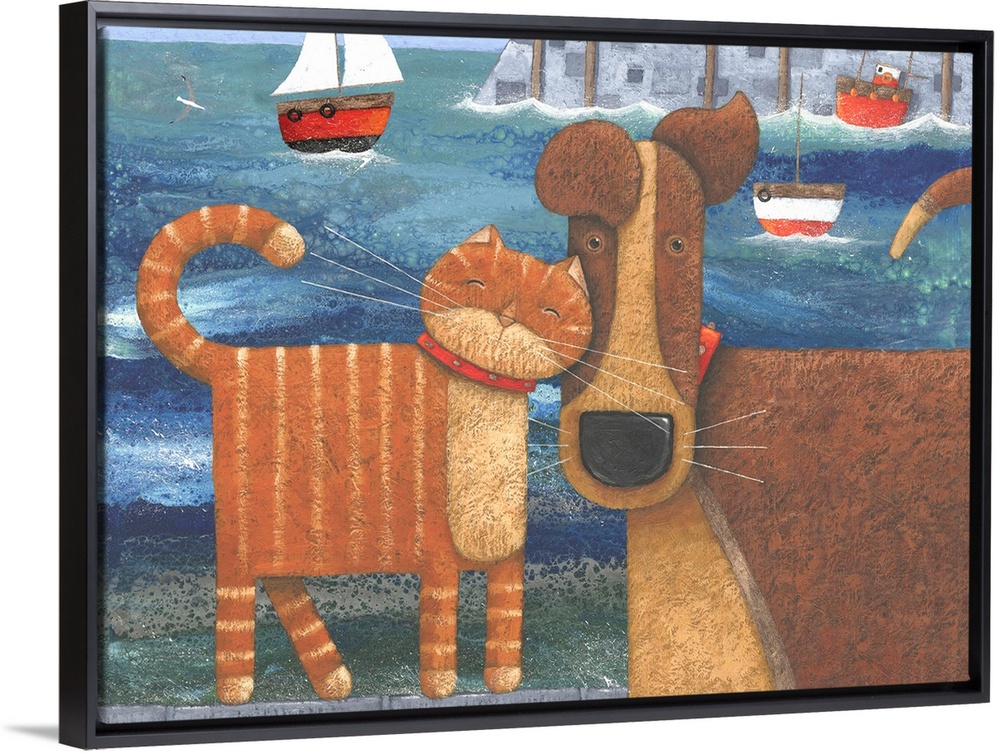<p>Nautical themed artwork of a dog being nuzzled by a cat with a harbor with sailboats in it in the background.</p>