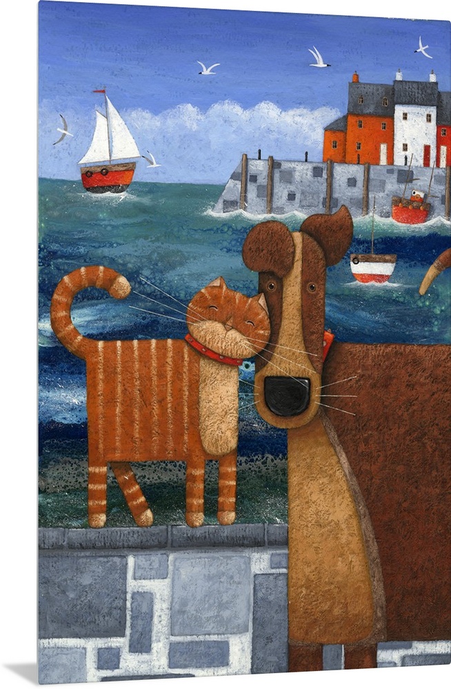 <p>Contemporary nautical painting of a cat nuzzling a dog, with a harbor town scene in the background.</p>