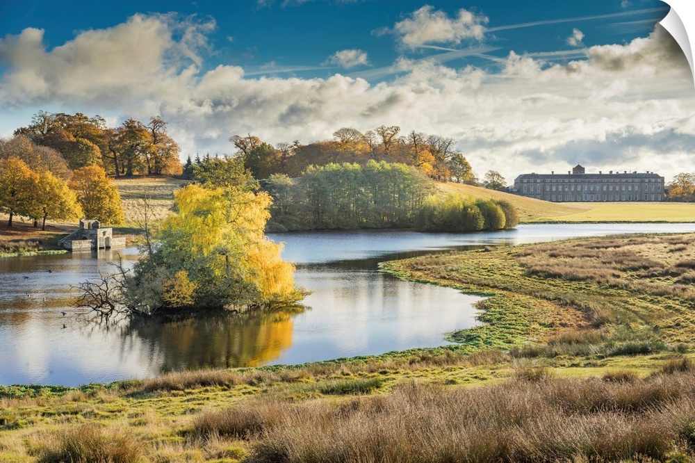 <p>Rural landscape of the West Sussex Downs from Petworth Park. Lake and trees with reflection.</p>
