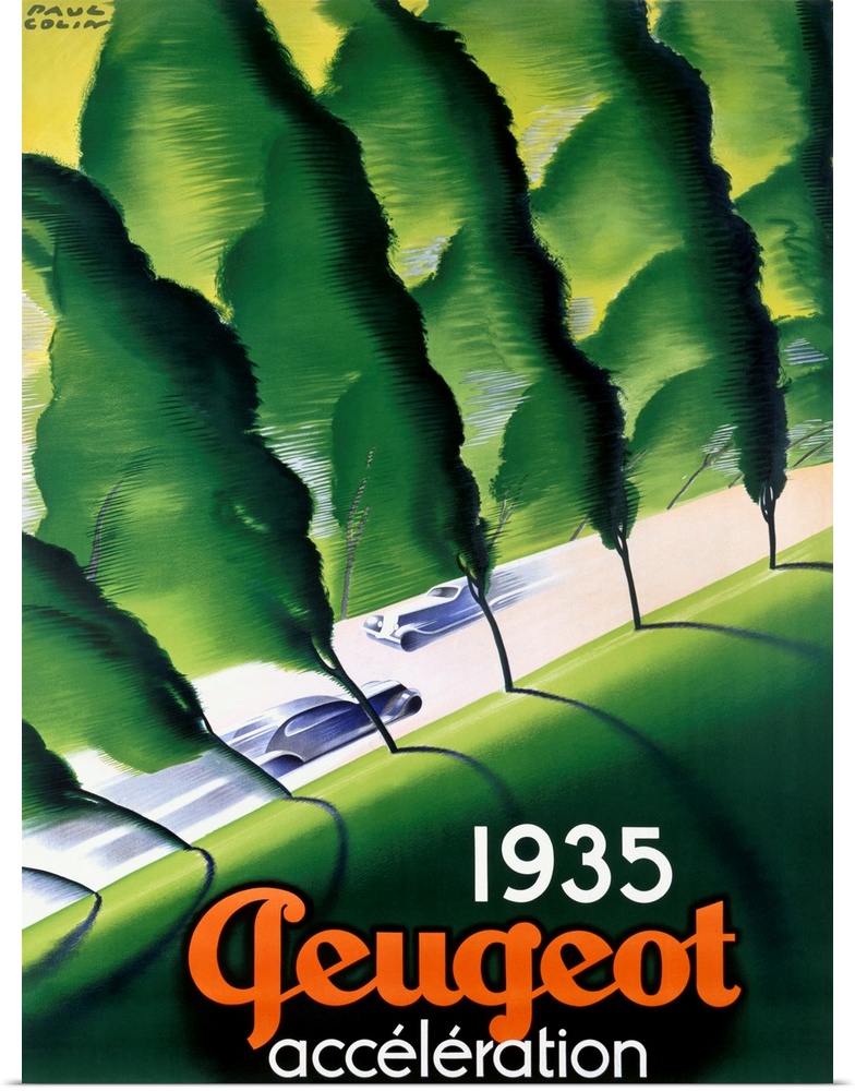 <p>A vintage poster with an aerial view of two cars zooming past each other on a road that is lined with tall trees.</p>