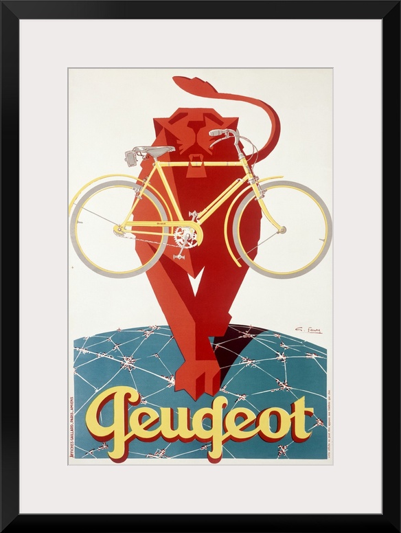 <p>Classic advertisement for Peugot Bicycles featuring a lion walking over what appears to be the globe with a bicycle in its mouth.</p>