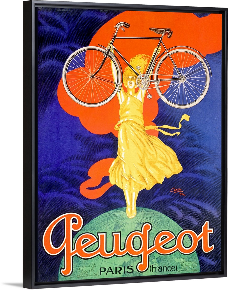 <p>Large antique art portrays an advertisement for a French bike company that features a woman standing on top of the Earth while holding up one of the bikes. Artist uses a lot of bold and bright colors in this advertisement and includes text for the piece at the bottom of the canvas art.</p>