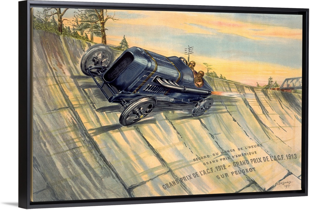 <p>This dynamic 1913 poster by artist A. Basange commemorates Peugeot's Grand Prix racing triumphs in 1912 and 1913, as well as a record-setting speed performance. It features a stylized race car and driver leaning into the steeply banked curves of a velodrome-like track-capturing the speed, risk, and elegance of early motorsport.</p>