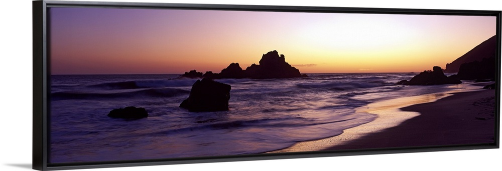 <p>Sunset panoramic of the rocky beach in California.</p>