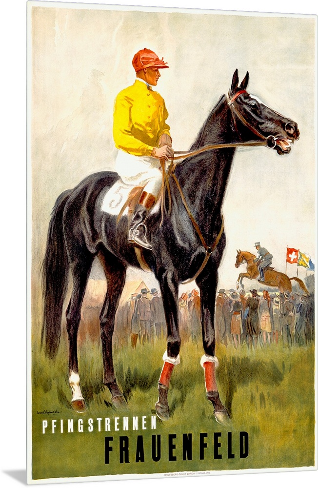 <p>Vintage poster of a jockey sitting on its horse while another jockey is competing with his horse behind him in front of a crowd of people.</p>