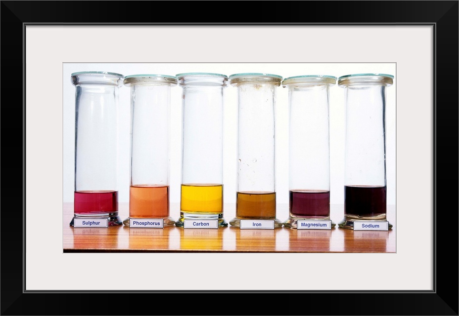 <p>pHs of oxide solutions. Aqueous solutions of the oxides of some elements with universal indicator (UI) added to show their pH (acidity). The element forming each oxide is labelled. The oxide of sulphur produces sulphuric acid, which has the lowest pH (strongest acidity). UI changes colour according to the pH, from red (most acidic) through yellow (mildly acidic) to blue (slightly alkaline) to purple (strongly alkaline). Sulphur oxide forms sulphuric acid in water, which is highly acidic. Sodium oxide forms sodium hydroxide (a strong alakai). Oxide pH increases from left to right across the periodic table.</p>